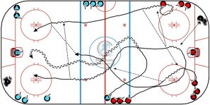 F1 picks up puck and passes to F2 who passes to F3. F2 curls from boards towards middle and F3 curls to boards from middle to outside. F3 goes in for shot then picks up…